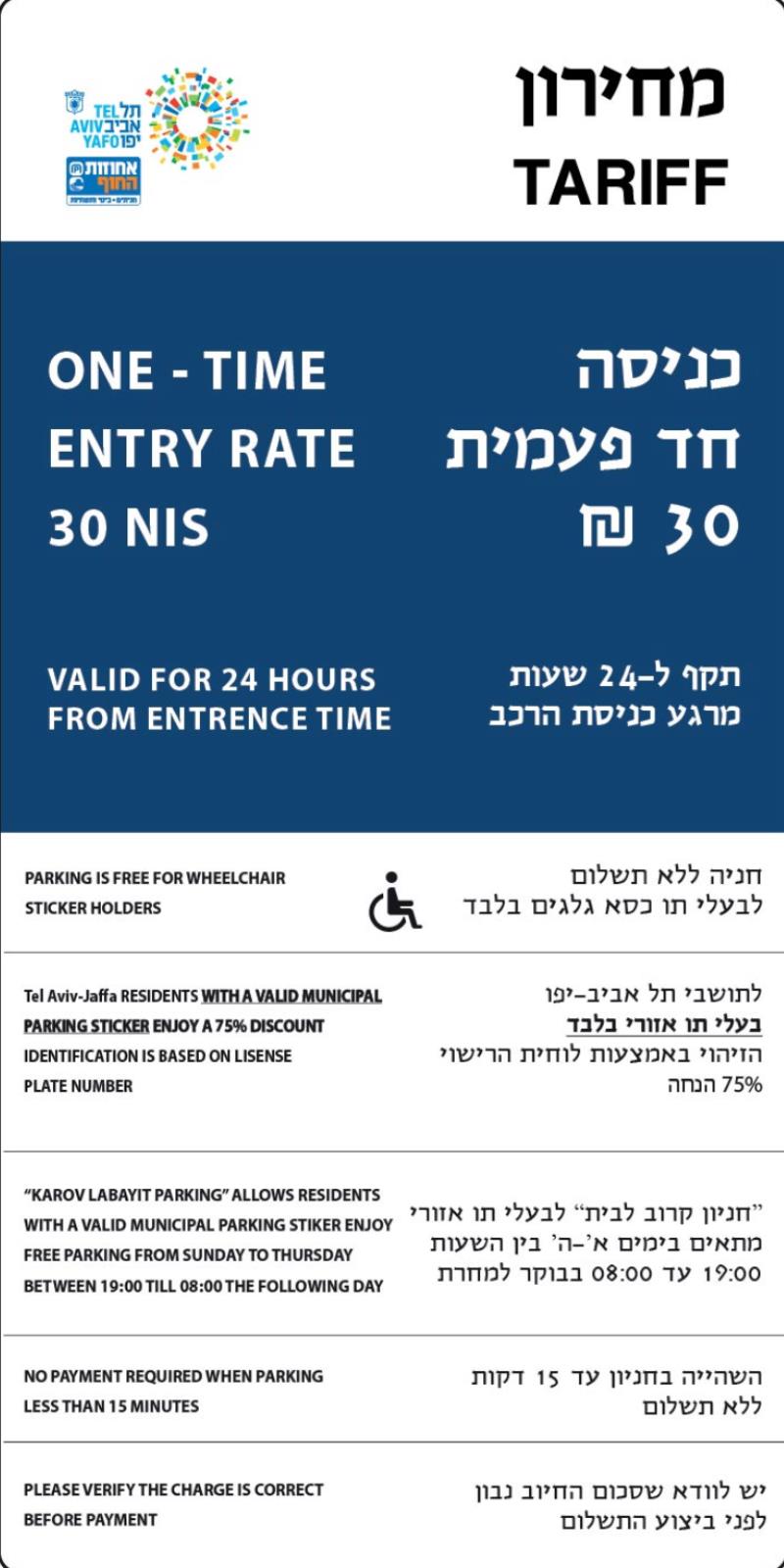 תעריף לכניסה חד פעמית 30 ₪, תקף ל-24 שעות מרגע כניסת הרכב