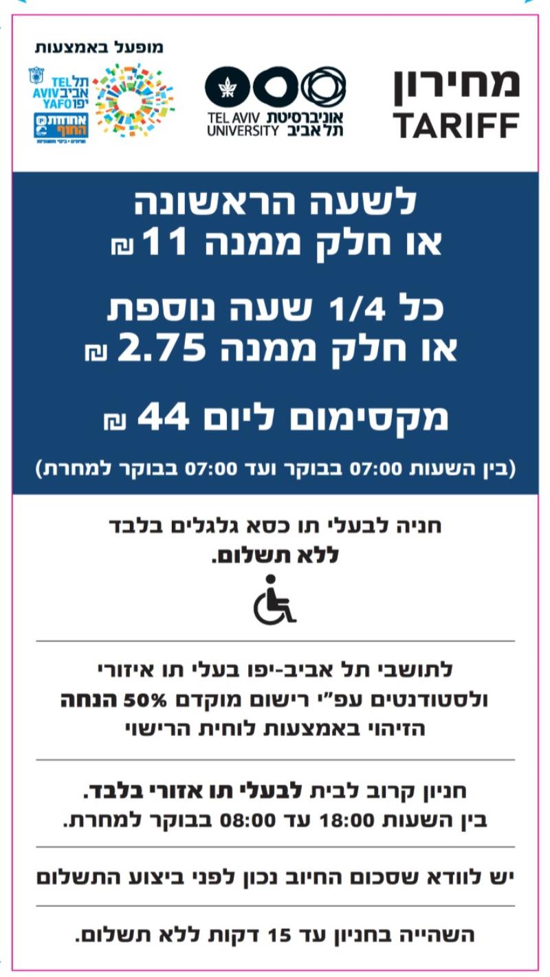 בחניון זה התשלום הינו רק בכרטיס אשראי ו/או ישומון סלולארי. לא ניתן לשלם במזומן. |